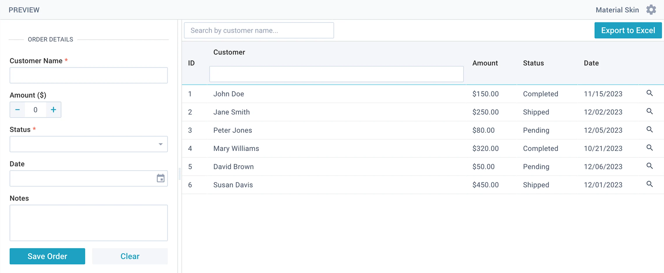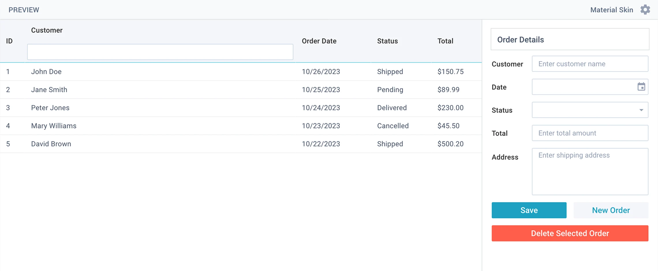 Use Webix to create an order management system with a table and form.
