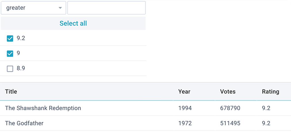 Filter for applying advanced number, text, and date filtering rules